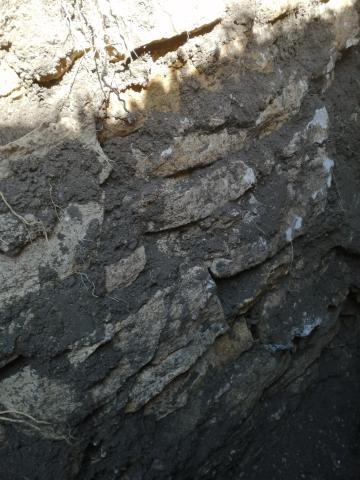 Nous creusons sur 1 m 70 de profond le long d'un mur enterré avant de toucher du dur au fond. Il s'agit de béton coulé, le mur repose dessus. Nous finissons à la barre à mine et à la pelle à maçon. Le béton mesure 40 cm de haut.